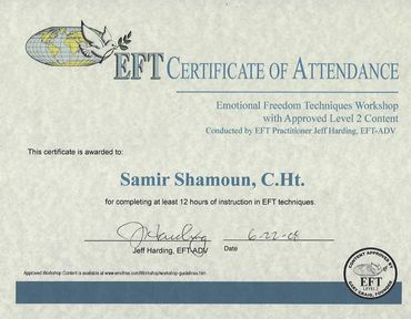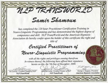 Certified as a Neuro Linguistic Programmer (NLP), Certified in Emotional Free Techniques (EFT), Practitioner of Emotional Release Therapy (ERT), Practitioner of Guided Imagery,
